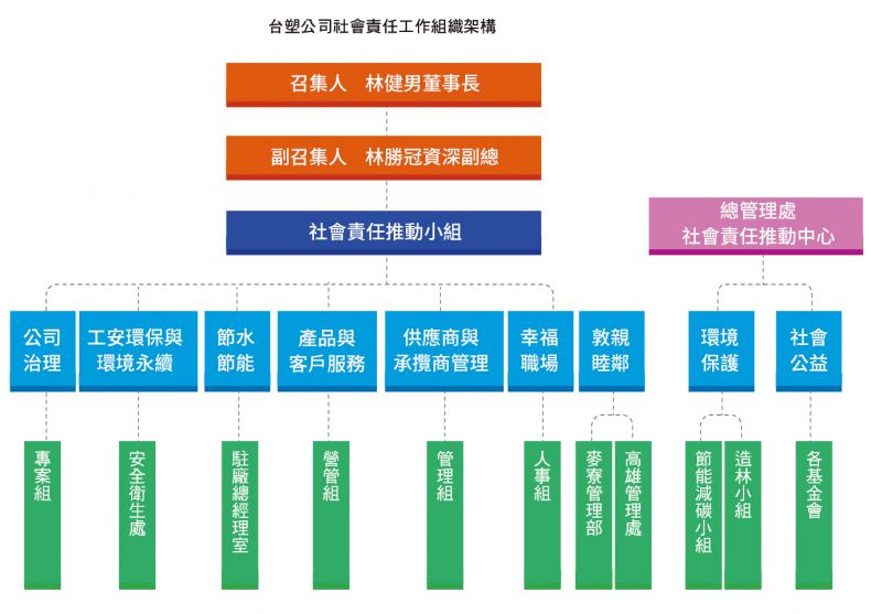 本公司推動企業社會責任專職單位本公司由林健男董事長擔任社會責任推動工作召集人、林勝冠資深副總擔任副召集人,負責台塑公司的社會責任策略擬訂及績效監督,配合總管理處「社會責任工作推動中心」執行社會責任工作。 本報告書之主題與議題編訂順序,係經本公司總經理室各機能組、安全衛生處、會計處及廠區管理部(處)等單位與「社會責任工作推動中心」成員於2017年初開會討論決定,報告內容彙總後呈報召集人、副召集人,並提董事會報告,以確認本報告書所揭露之議題符合利害關係人之需求。 本公司2017年度執行情形及企業社會責任報告書,已於2018年6月20日提董事會報告。