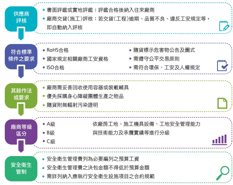 供應商評核欲申請與本公司往來之供應商均需通過書面評鑑,必要時需進行實地評鑑,並於評鑑合格後方可納入往來之合作廠商。若後續有交貨(工程)逾期、品質不良、違反工安規定者,將自動列入廠商評核機制,篩選出適合與本企業長期合作之優質夥伴廠商。 本公司於每次採購時,均要求上游供應商需符合RoHS合格、國家規定相關廠商工安資格、ISO合格、隨貨標示危害物公告及圖式等標準條件,且廠商需妥善回收使用容器或裝載輔具,優先採購身心障礙團體生產之物品及隨貨附無輻射污染證明等,於「詢價單」與「訂購通知」中要求供應商確實遵守規定,以及遵守公平交易原則,致力要求往來廠商符合環保、工安及人權之需求,若不符合規定,將予以拒收並列入廠商評核作業等處分。 本公司之採購及發包政策係以當地採購及發包為主,若無法於當地供應時,才向國外進行採購及招標,2017年當地採購比率為78%。 承攬商分級管理制度爲強化良好的安全管理措施,控管承攬商品質,提高承攬商的工安水準,避免其員工遭受職業傷害,對於承攬本企業工程之承攬商,我們訂定分級管理制度。針對各類專業工程廠商蒐集相關資料、調查評鑑廠房工地、施工機具設備、工地安全管理能力與技術能力及承攬實績等,依其可承攬能力及實績,區分為A、B、C三級;另將安全衛生管理費列為必要編列之預算工資,且需詳列納入應執行安全衛生設施項目之合約規範。而為避免預算部門漏編安全衛生管理費,於預算編列時由電腦自動補入;發包詢價時亦管制安全衛生管理費之決包金額不得低於預算金額,以免廠商因低價搶標而怠忽安全衛生管理工作。 |